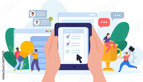 Огромный монитор компьютера и смартфон, микро-персонажи, задающие вопросы онлайн, совершающие телефонные звонки и получающие ответы чат-бота. Услуги консультанта чат-бота с искусственным интеллектом, помощника, агента службы поддержки клиентов.
