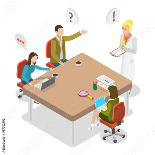 Концепция кредитного скоринга искусственного интеллекта. Векторная изометрическая иллюстрация робота-автомата с искусственным интеллектом с измерителем кредитного рейтинга и людьми, ожидающими в очереди для машинного обучения их кредитоспособности.