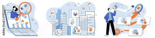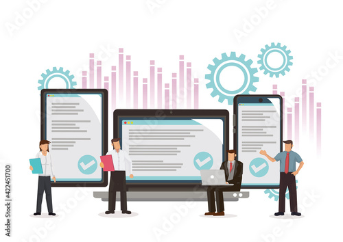 Процесс машинного перевода, плоская векторная иллюстрация. Искусственный интеллект, роботы-машины, переводящие контент с одного иностранного языка на другой. Электронный переводчик иностранного языка.