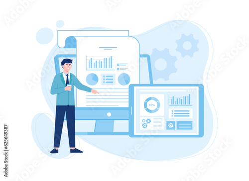 Искусственный интеллект работает лучше, чем человек, плоская векторная иллюстрация. Робот-машина и деловая женщина, работающие на компьютерах и отмечающие контрольный список. Искусственный интеллект против производительности человека. Превосходство роботов.