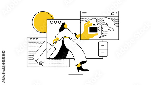 Огромный кондиционер и микросимволы специалистов по ремонту и техническому обслуживанию кондиционеров, векторная иллюстрация. Услуги по кондиционированию воздуха и состав технического обслуживания для веб-баннера, страницы веб-сайта.