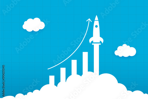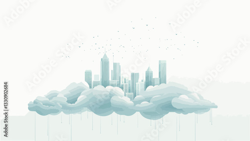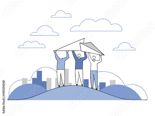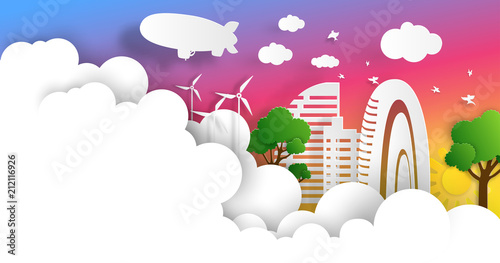 Векторное многослойное вырезанное из бумаги небо в стиле, пушистые облака, самолет, пролетающий над городскими зданиями. Путешествия по всему миру, авиаперелеты, концепция time to travel для веб-баннера, страницы веб-сайта и т.д.