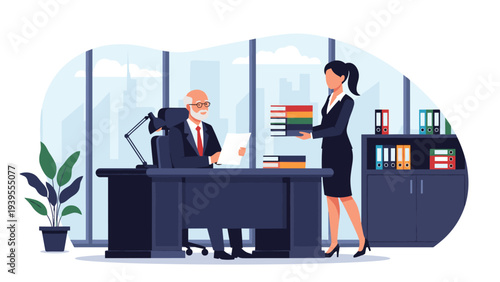 Векторная иллюстрация стюардессы, обслуживающей пассажира первого класса на рейсе. Дизайн в плоском стиле.