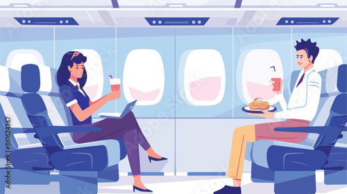 Интерьер салона самолета с людьми на борту. Концепция векторной иллюстрации, нарисованной от руки. Пассажиры, сидящие на стульях в самолете во время полета. Люди путешествуют на самолете эконом-классом.