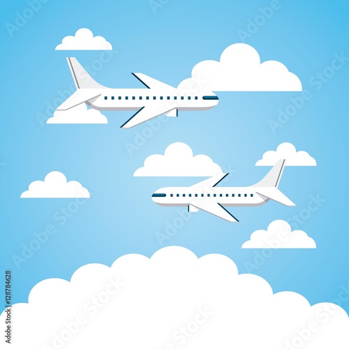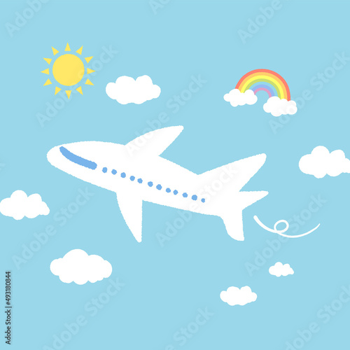 Самолет в небе рисует радугу над векторной иллюстрацией облака. Фон путешествия самолета в стиле вырезанного из бумаги художественного ремесла. Полетное приключение на каникулах концепция отпуска