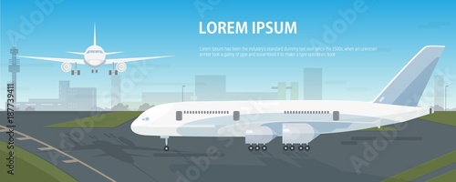 Здание аэропорта и самолет на взлетно-посадочной полосе векторная иллюстрация. Плоский фон аэровокзала с авиалайнером, движущимся по взлетно-посадочной полосе. Архитектура прибытия и отбытия