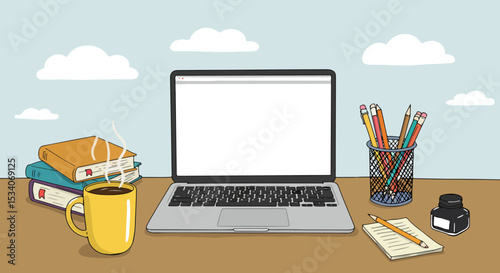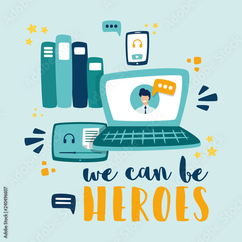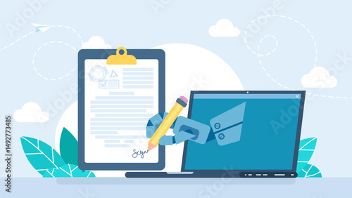 Векторная плоская иллюстрация аэропорта. Ноутбук, билеты, паспорт, багаж, одноразовая кофейная чашка. Услуги авиакомпаний для путешествующих пассажиров, онлайн-концепции билетов для веб-баннера, страницы веб-сайта и т.д.