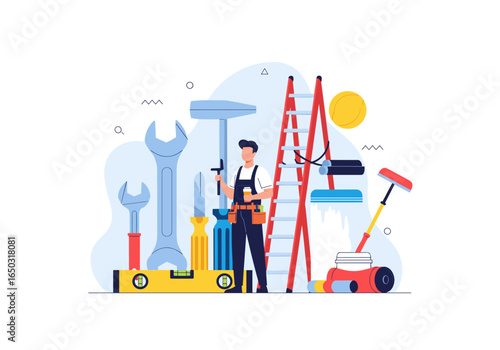 Векторная плоская иллюстрация аэропорта. Самолет, багаж, кофейная чашка, авиационный спасательный жилет и ремень безопасности и т.д. Оборудование безопасности на борту, концепция обслуживания на борту самолета для веб-баннера, страницы веб-сайта и т.д.