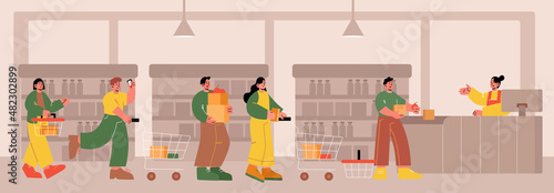 Терминал аэропорта, сцена зала ожидания, плоская векторная иллюстрация. Пассажиры регистрируются, ждут рейса в зале вылета, сидят на стульях, ходят с багажом.