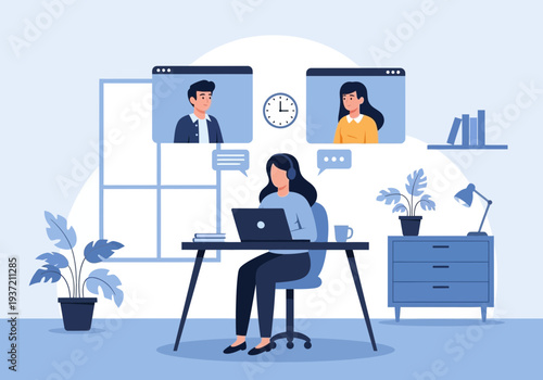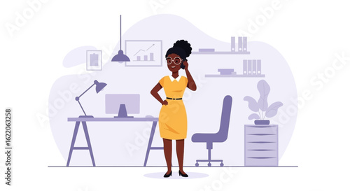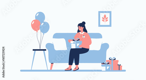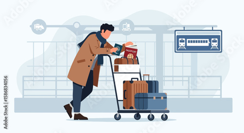 Зал ожидания аэропорта. Девушка-пассажир с багажом, паспортом и билетом в ожидании рейса, плоская векторная иллюстрация. Зал ожидания в аэропорту. Путешествие на самолете.