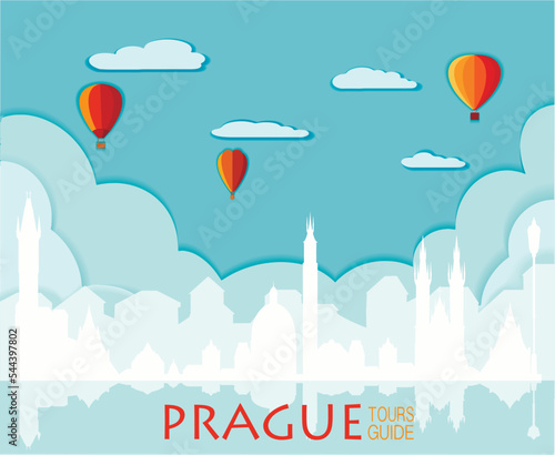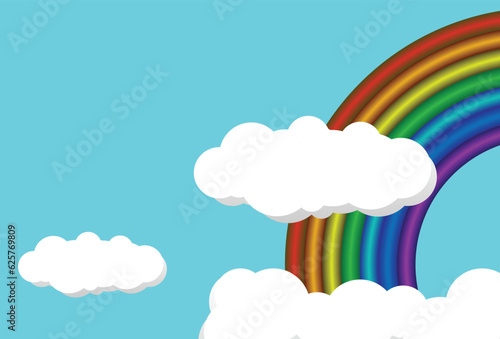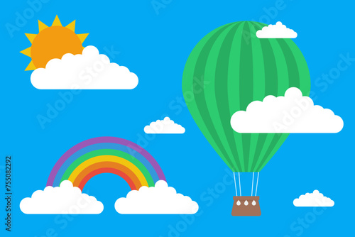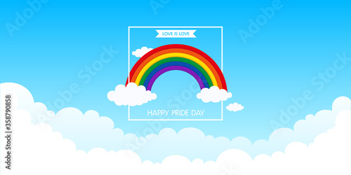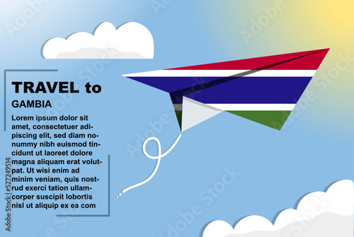 Дирижабль с красной лентой радуги и облаками в небе. Векторная иллюстрация в стиле бумажного искусства. Шаблон дизайна баннера туристического плаката.