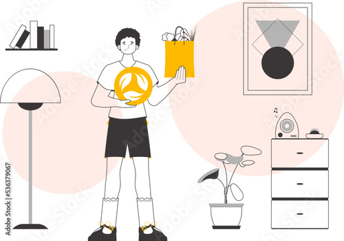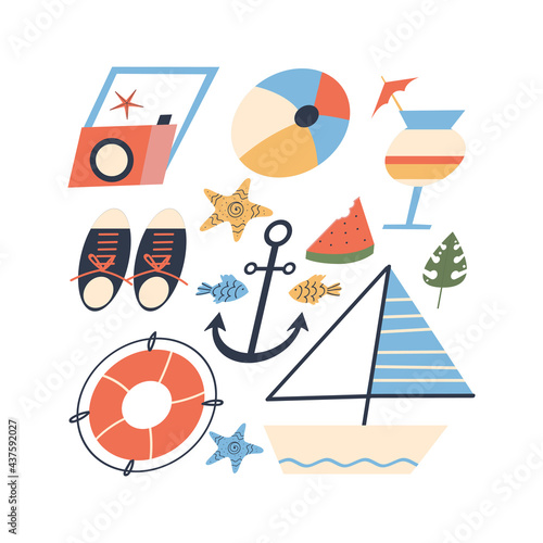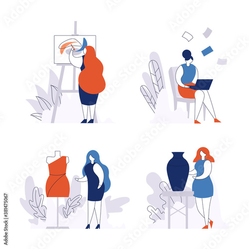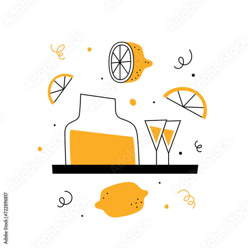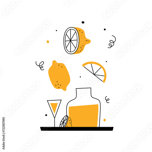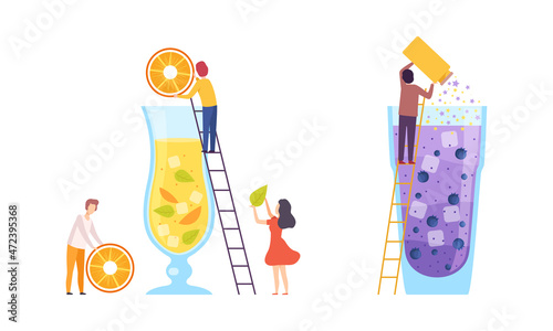 Векторная иллюстрация крошечных персонажей-барменов, готовящих яркий вкусный алкогольный напиток, кладущих кубики льда, вишню и ломтик апельсина в большой коктейльный бокал. Коктейльная вечеринка, бар, ресторан, ночной клуб.
