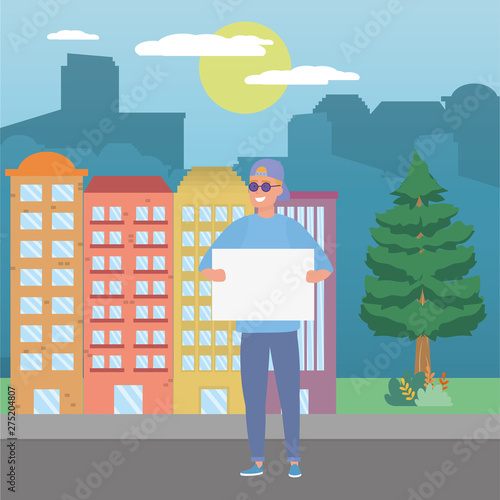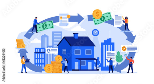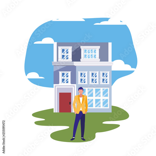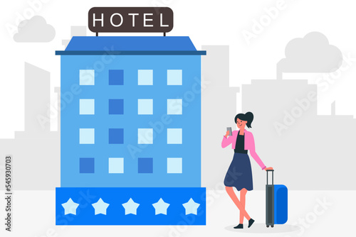Гостиничный отель, векторная иллюстрация дизайна в плоском стиле. Роскошное здание отеля, персонажи - путешественники мужчина и женщина. Концепция отелей и курортов "все включено" для веб-баннера, страницы веб-сайта и т.д.