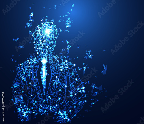Векторная шахматная пешка в многоугольном художественном стиле с тенью шахматного короля. Низкополигональная каркасная сетка с рассеянными частицами и световыми эффектами на темно-синем фоне. Шаблон дизайна плаката и баннера концепции амбиций