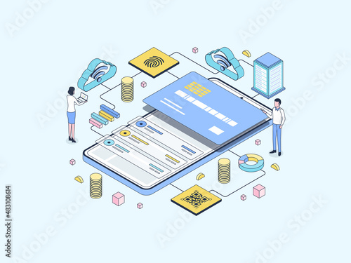 Текстовые комментарии к американскому футболу в прямом эфире, дизайн целевой страницы, шаблон баннера веб-сайта, плоская векторная изометрическая иллюстрация. Футбольный фанат следит за любимой командой, игроком, получает результаты в реальном времени, статистику.
