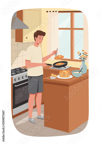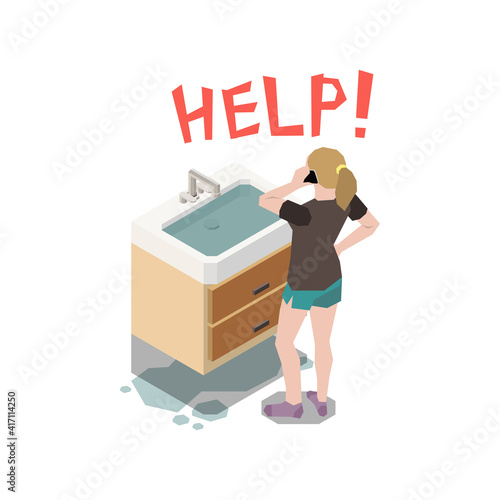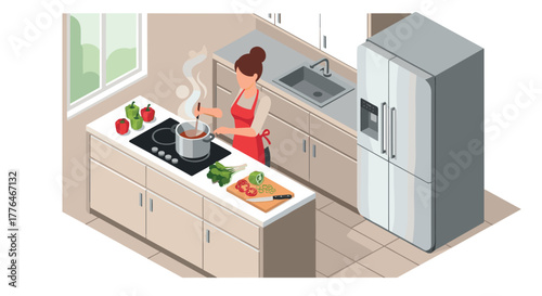 Женщина с ампутированной рукой и бионическим вектором руки. Изометрический женский персонаж с протезом руки готовит на кухне, выделенный на белом фоне. Образ жизни людей с ограниченными возможностями