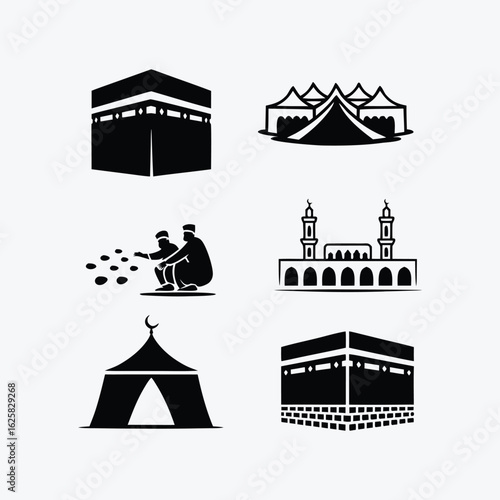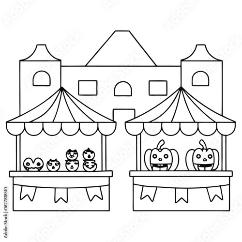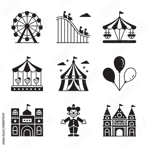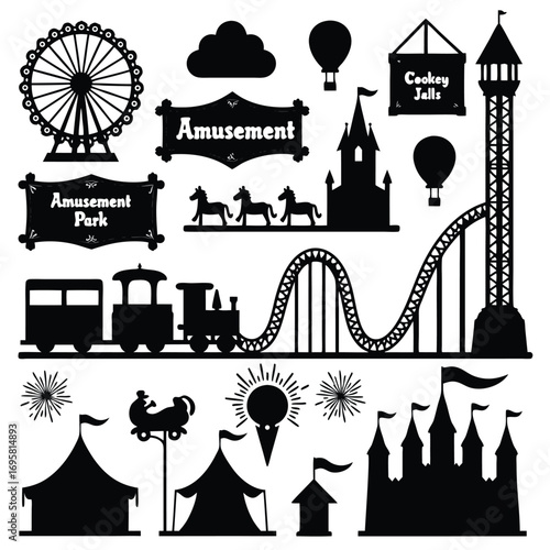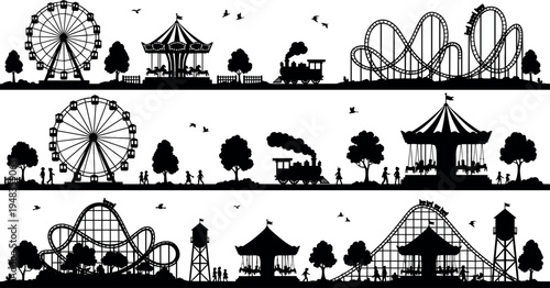 Черно-белый силуэт изолированного набора аттракционов парка развлечений. Ярмарочный фестиваль карнавал, цирк и ярмарка развлечений карусели, колесо обозрения с каруселью, детская площадка с американскими горками векторная иллюстрация