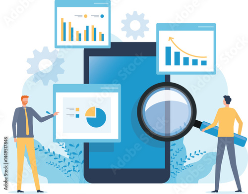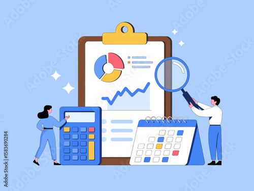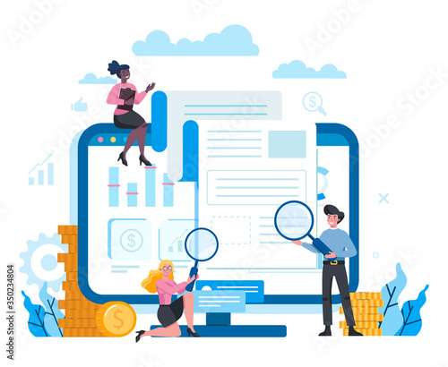 Команда финансовых аналитиков крошечные мультяшные персонажи взаимодействуют с большой статистической панелью, составляют аналитический отчет, векторная иллюстрация. Бизнес-анализ, концепции аудиторских услуг для страницы веб-сайта и т.Д
