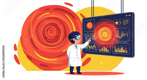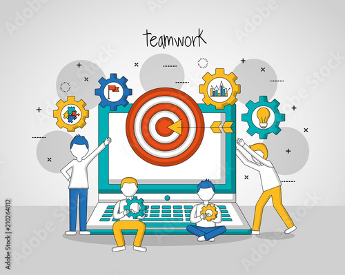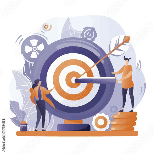 Векторная иллюстрация крошечных персонажей бизнес-аналитики или аудиторы анализируют статистические данные для принятия стратегических бизнес-решений с помощью большого портативного компьютера с целью на экране. Концепция аналитики.