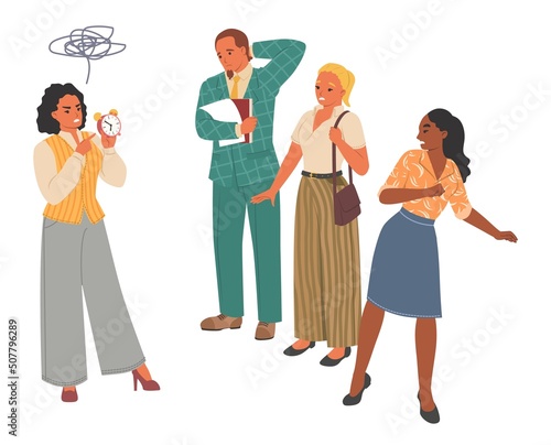Сердитая женщина-босс и вектор конфликта бизнес-команды. Агрессивная женщина кричит на сотрудника, недовольного группой менеджеров по поводу срыва дедлайна иллюстрация. Стресс, непонимание на работе