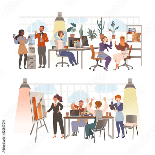 Сердитая женщина-босс вектор. Декорации деловой сцены. Разгневанный персонаж женского пола кричит на сотрудников офисной команды. Конфликты и стресс на рабочем месте. Сумасшедшая бизнесвумен и расстроенная команда