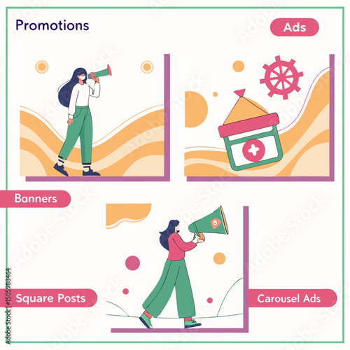 Набор шаблонов горизонтального баннера объявления, векторная иллюстрация дизайна в плоском стиле. Люди с мегафонами и речевыми пузырями для текста.