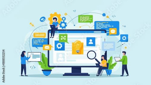 Шаблон веб-сайта с антивирусным вектором, дизайн веб-страницы и целевой страницы для разработки веб-сайтов и мобильных сайтов. Концепция антивирусного программного обеспечения с большим компьютером, экраном, замком и крошечными людьми, ловящими ошибки.