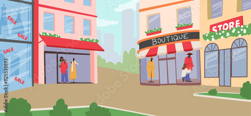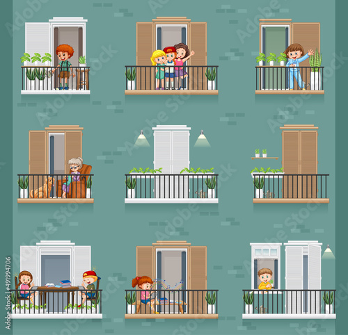 Внешний вид многоквартирного дома, соседи сидят, стоят у окна внутри дома, на балконе, плоская векторная иллюстрация. Люди читают книги, поливают цветы. Жилой дом и жители.