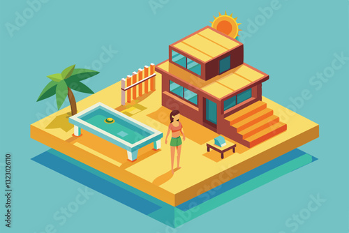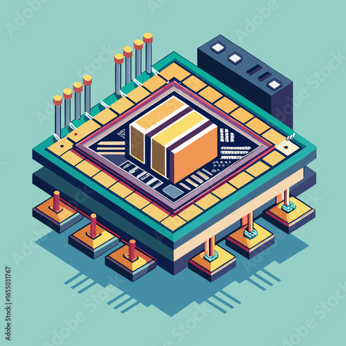 Векторный плоский изометрический плакат для строительства квартир, баннер с раскопками, литьем колонн, установкой пола, элементами дизайна стен и копированием пространства.