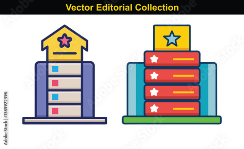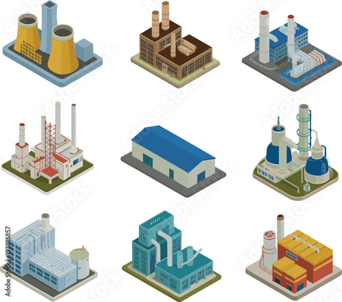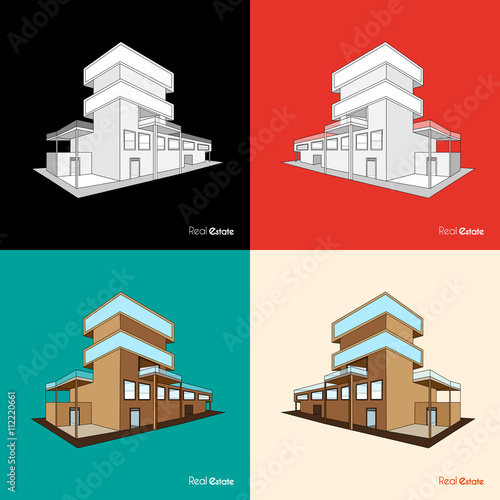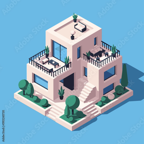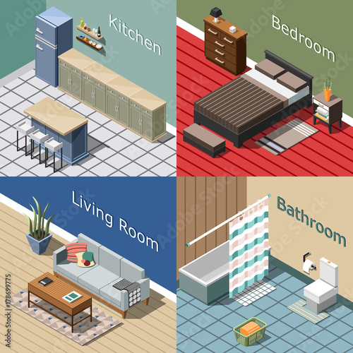 Векторный плоский изометрический плакат для строительства квартир, набор баннеров. Фундамент и колонны, Монтаж пола, Возведение стен, Элементы дизайна дверей и окон.