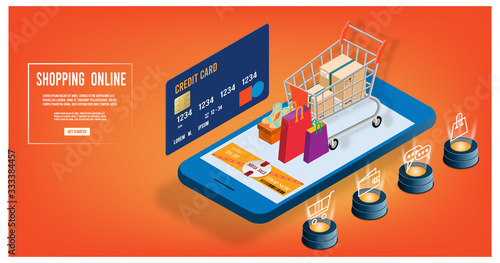 Приложения для общественного питания веб-баннер, шаблон. Векторный изометрический смартфон с автомобилем, едущим по городской улице со зданиями и бургером с маркером карты на экране, пробел для копирования, кнопка "Подробнее".