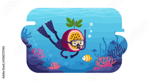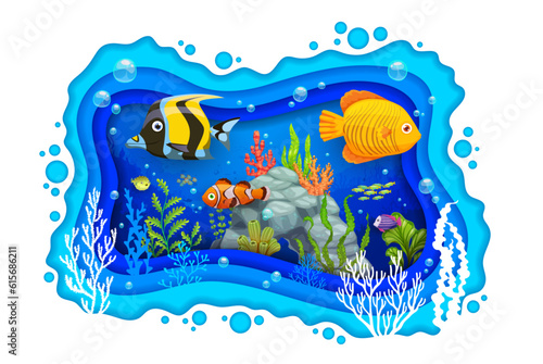 Вырезанная из векторной бумаги подводная морская пещера с коралловым рифом, рыбой, морскими водорослями. Ландшафт глубокого океанского дна и морская флора и фауна. Концепция аквариума или общественных аквариумов для веб-баннера, страницы веб-сайта и т.д.