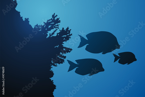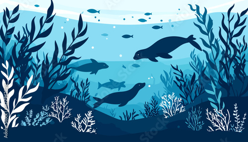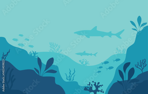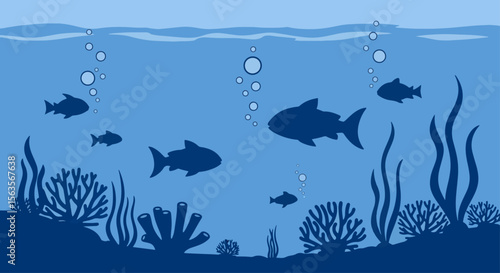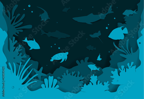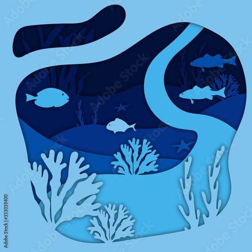 Векторный многослойный вырезанный из бумаги пейзаж глубокого океанского дна с коралловым рифом, рыбой, морскими водорослями. Красивый подводный мир в общественном аквариуме в стиле бумажного искусства. Аттракционы для подводной морской прогулки.