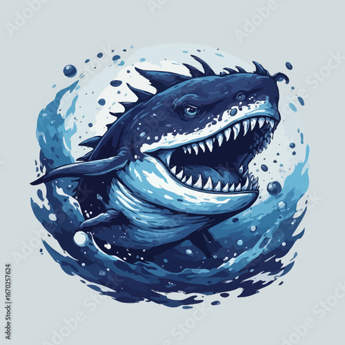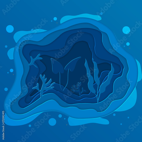 Векторная многослойная вырезка из бумаги в стиле подводной пещеры, тропических экзотических рыб, водных растений и затонувших городских зданий. Аквариум, пейзаж с глубоким океанским дном, украшения для аквариумов в стиле бумажного искусства.