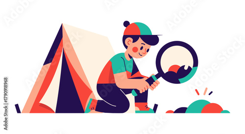 Микро мужские персонажи археологи, работающие на месте археологических раскопок с большим увеличительным стеклом, лопатой и киркой, человеческие останки в песке, векторная иллюстрация. Концепция археологических раскопок.