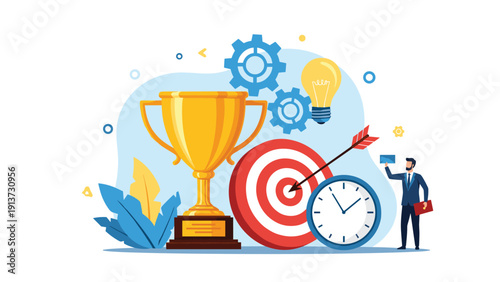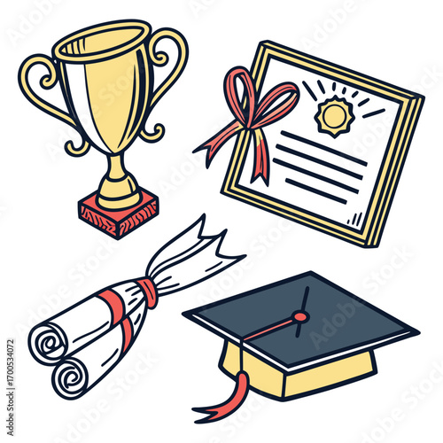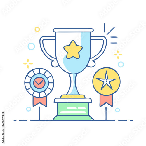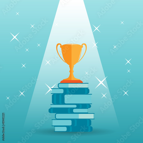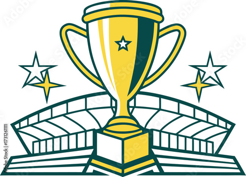 Эмблема конкурса художников, логотип, векторная иллюстрация. Реалистичный золотой кубок-трофей на пьедестале почета победителя, художественная палитра, кисти, тюбики с краской и карандашная композиция для плаката художественного конкурса, баннера и т.д.