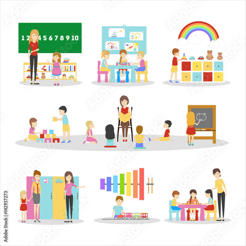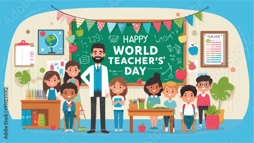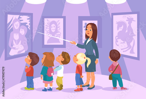 Экскурсия по художественному музею для школьников с гидом. Векторная иллюстрация дизайна в плоском стиле.
