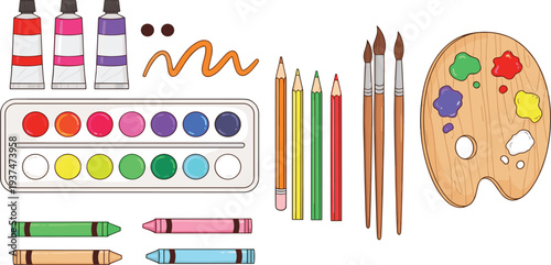 Рамка для художественных инструментов и материалов, векторная иллюстрация. Реалистичная живопись и чертежные принадлежности палитра художника, кисти, тюбики с краской, ножи и карандаши, акварель, пространство для копирования.