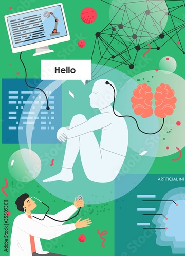 Шаблон векторного дизайна плаката с технологией искусственного интеллекта. Человеческий мозг подключен к ИИ. Машинное обучение, анализ мозговой активности, дополненный интеллект.