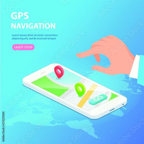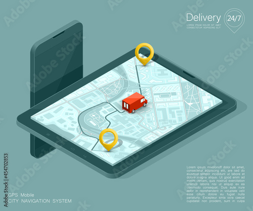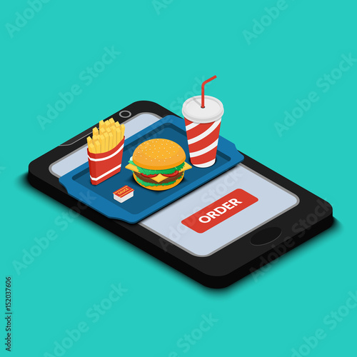 Концепция азиатской кухни онлайн. Векторный изометрический смартфон с приложением доставки азиатской кухни. Суши и другие азиатские блюда навынос, навигационная карта с пин-кодом и кнопка "Купить сейчас" на экране смартфона.