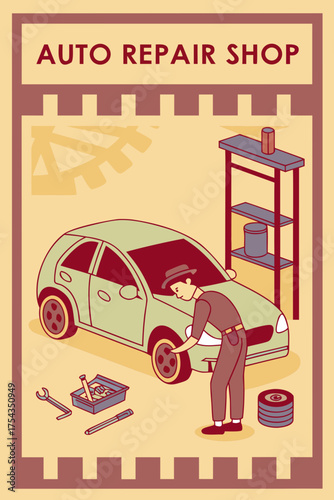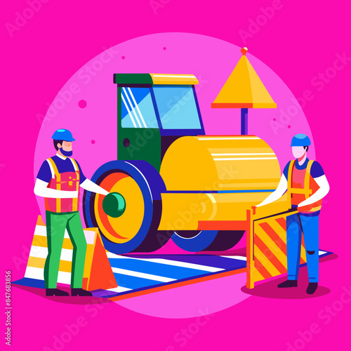 Векторная иллюстрация ремонта, технического обслуживания и строительства дорог. Рабочие мужского пола управляют желтым асфальтоукладчиком, работают лопатой, держат дорожный конус. Укладка асфальтобетонного покрытия