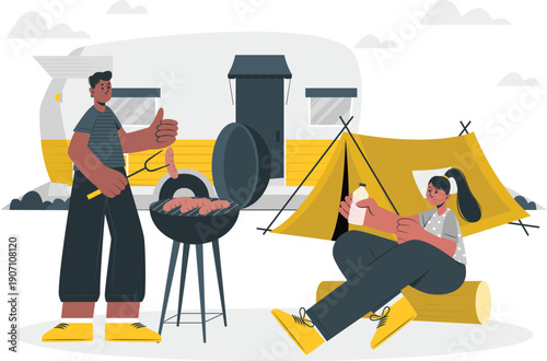 Векторная иллюстрация ремонта, технического обслуживания и строительства дорог. Мужские персонажи - рабочие за рулем желтого асфальтоукладчика, работающие с отбойным молотком, тачкой. Услуги по укладке и ремонту асфальтобетона