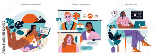 Космонавт в открытом космосе и в кабине ракеты открытка, баннер, листовка или шаблон обложки изолированный набор. Векторная иллюстрация персонажей космонавта-исследователя галактики