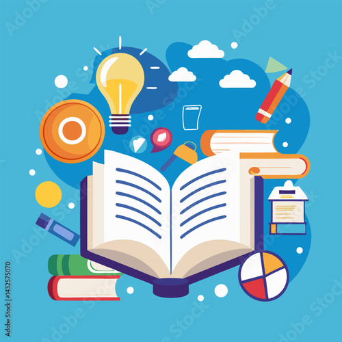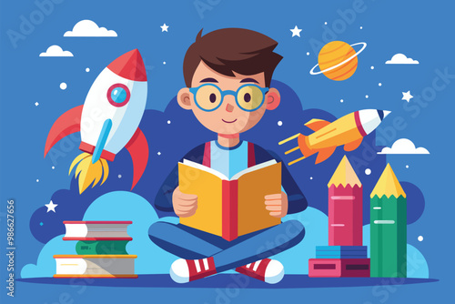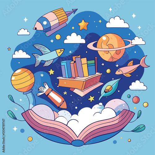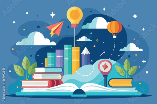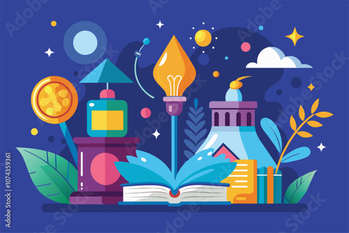 Фон научного плаката по астрономии с книгой, учебными материалами по телескопу, обсерваторией для изучения космоса, изучающей космическое пространство над планетой звездного ночного неба, кометой, метеором и звездным созвездием