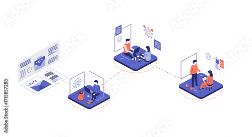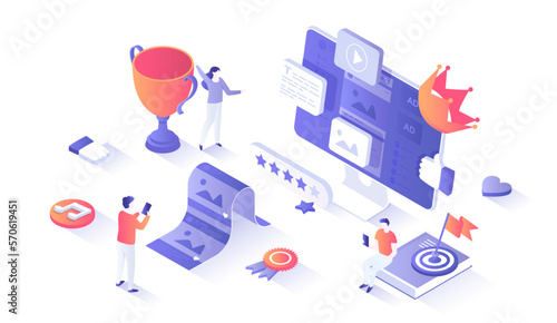 Изометрическая блок-схема аукциона и торгов, векторная инфографика. Аукционист с молотком объявляет цены, а люди с веслами для ставок покупают автомобиль, дом, предметы антиквариата. Онлайн-аукцион и мобильные торги.