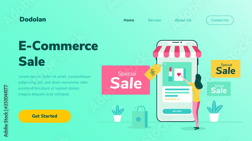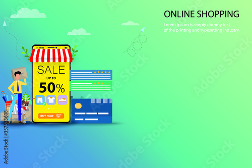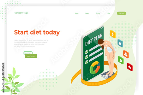 Шаблон веб-сайта целевой страницы аудиокниг онлайн. Векторная изометрическая иллюстрация человека, стоящего перед смартфоном с книгами и наушниками. Концепция онлайн-книг.