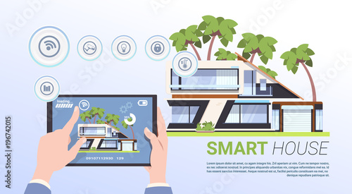 Векторная иллюстрация маркетинговой технологии дополненной реальности. Руки просматривают улицы города с помощью планшета с приложением ar, которое показывает магазины и информацию о новых коллекциях, специальных предложениях, скидках, новом меню.