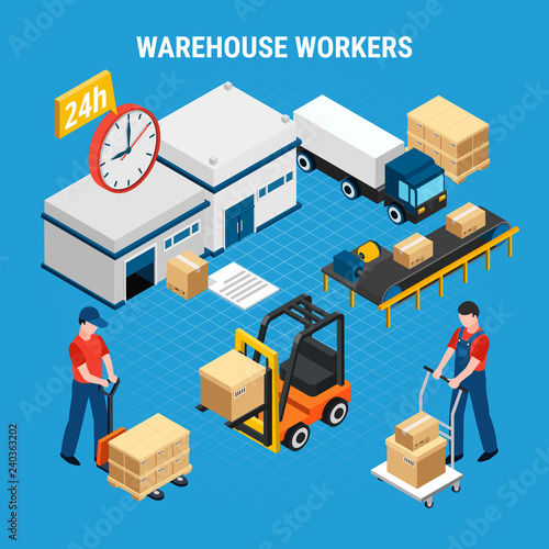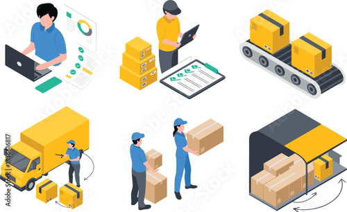Грузовые роботы, плоская векторная изометрическая иллюстрация. Автоматизированная линия, милые роботы, упаковывающие картонные коробки. Концепция промышленной автоматизации и робототехники.