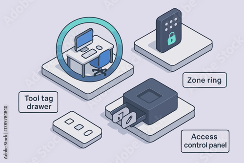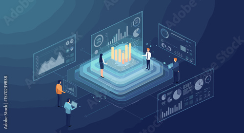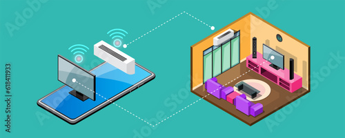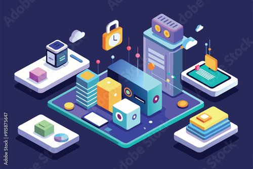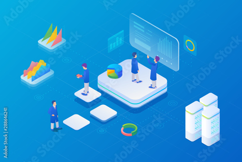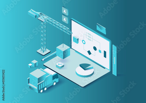 Промышленные роботы, плоская векторная изометрическая иллюстрация. Автоматизированная производственная линия, милые роботы, компьютер. Автоматизация производства и робототехнические технологии.