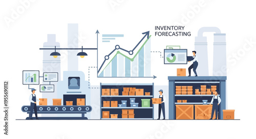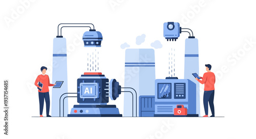 Автоматизированная производственная линия, плоская векторная иллюстрация. Роботы-машины, работающие на промышленном автоматическом конвейере с картонными коробками. Роботизированный процесс сборки и упаковки. Автоматизация промышленности.